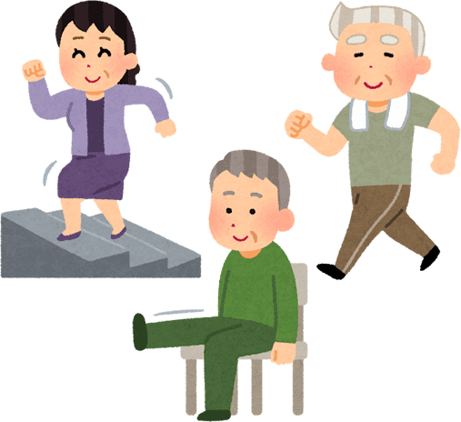 家庭で実施できる運動には椅子立ち上がり運動、片足立ち、踵上げ、ゆっくり歩行や足踏みなどがあります。