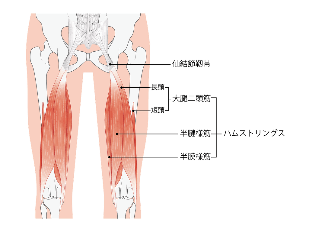 大腿二頭筋は外側で膝の外旋にも関与し、半腱様筋と半膜様筋は内側に位置して股関節伸展と膝屈曲での協調が強い特徴があります。
