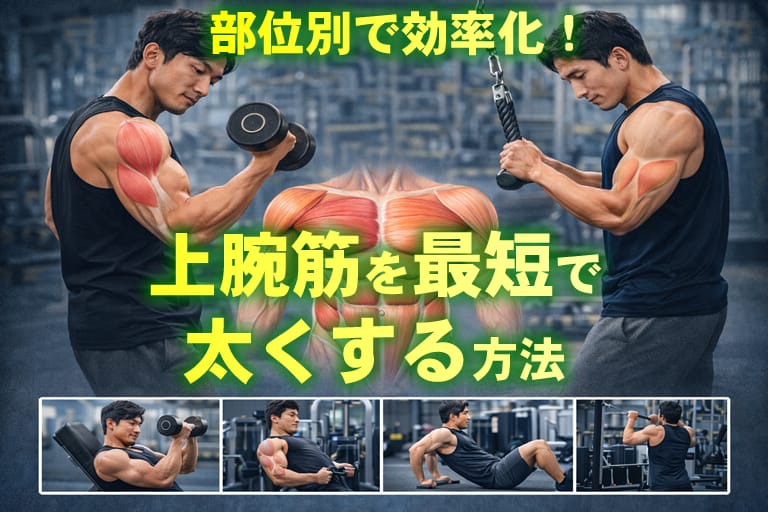 この記事は上腕筋を効率よく太くしたいと考える初心者から中級者までを対象に、部位別の役割理解から具体的な種目、分割プラン、栄養と回復までを一貫して解説する内容です。器具あり・なし両方の選択肢と期間ごとの現実的な目安を示し、最短で変化を出すための優先順位と注意点を明確にします。この記事を読めば、どの部位にどれだけの負荷を入れ、どの頻度で回復させるかが一目で分かるようになります。